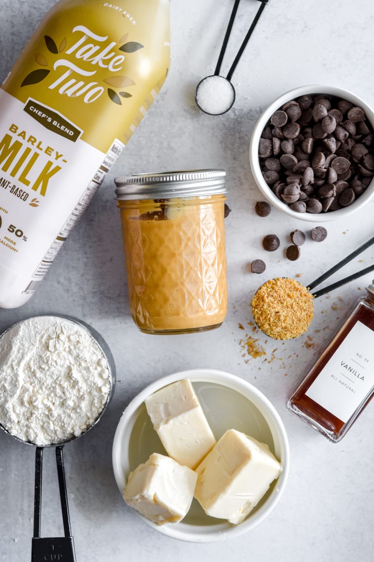 Add butter, peanut butter, vanilla extract, milk, flax eggs, maple syrup, and brown sugar to a bowl. Whisk to combine.
