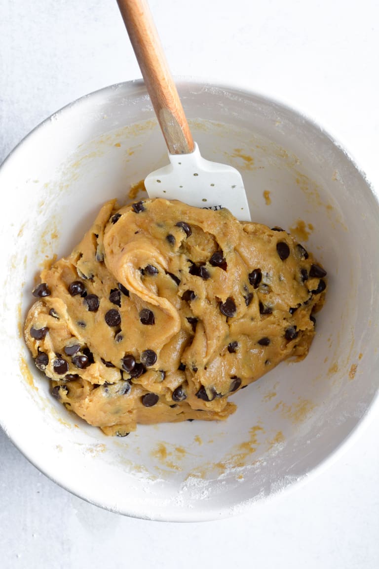 Pour batter into your prepared baking dish and spread evenly using a rubber spatula. Top with some extra chocolate chips. Bake for 25-30 minutes, or until golden and a tooth pick comes out clean.