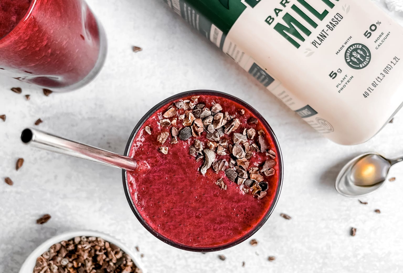 Made for Take Two by Pinch of Parsley this decadent plant-based smoothie is packed with nutritional power and antioxidants from both beets and cacao nibs, and plant-based complete protein so you feel full.