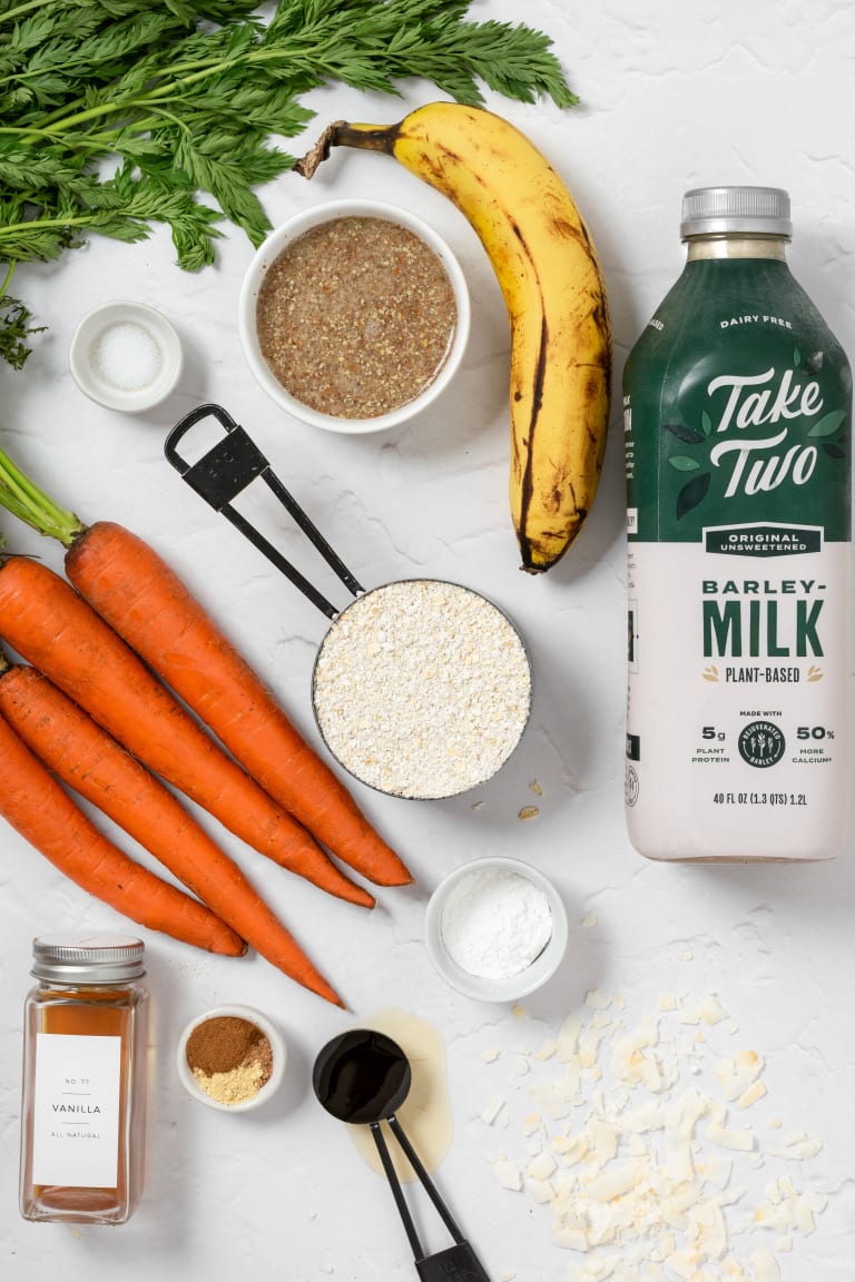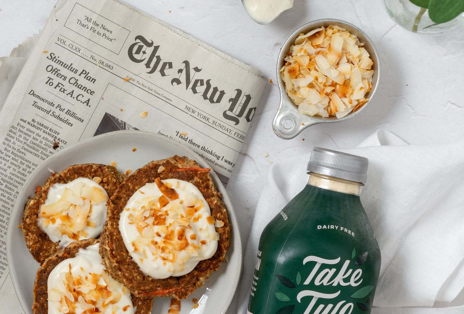 - Cream cheese frosting (4 ounces vegan cream cheese + 2 tablespoons powdered sugar + 1 tablespoon Take Two Original Barleymilk)
