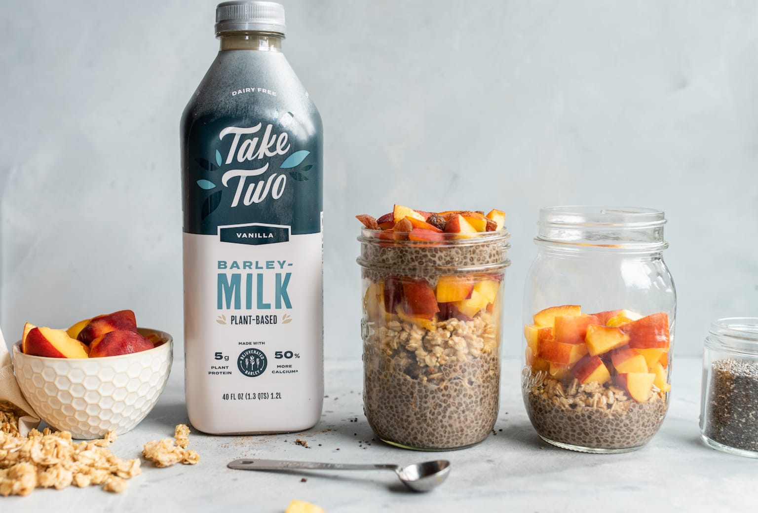 Our Take Two Spiced Peach & Apricot Chia Pudding is a healthy, delectable summer snack. The creaminess of Take Two Barleymilk perfectly complements the fresh, juicy peaches and the aromatic spices used in the recipe. This recipe also incorporates a variety of textures — from the tapioca-like chia pudding, to the soft peaches and chewy apricots, to the crunch of the granola. Barleymilk contributes protein and calcium, and chia seeds are a good source of protein, fiber, and healthy omega-3 fatty acids. In other words, this is a sweet snack you can eat in one sitting, and feel absolutely great about!