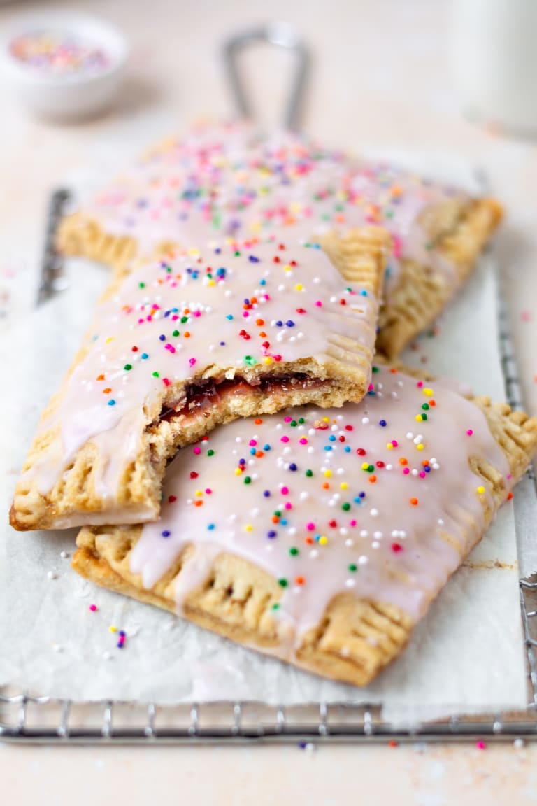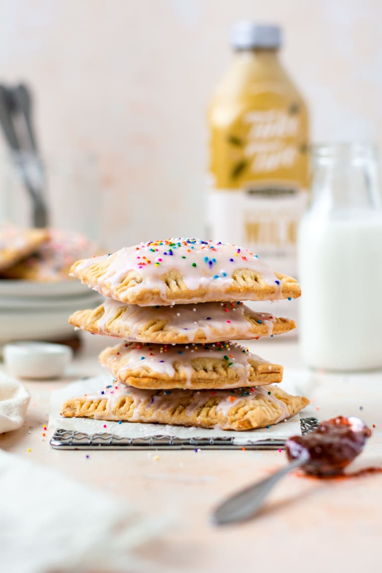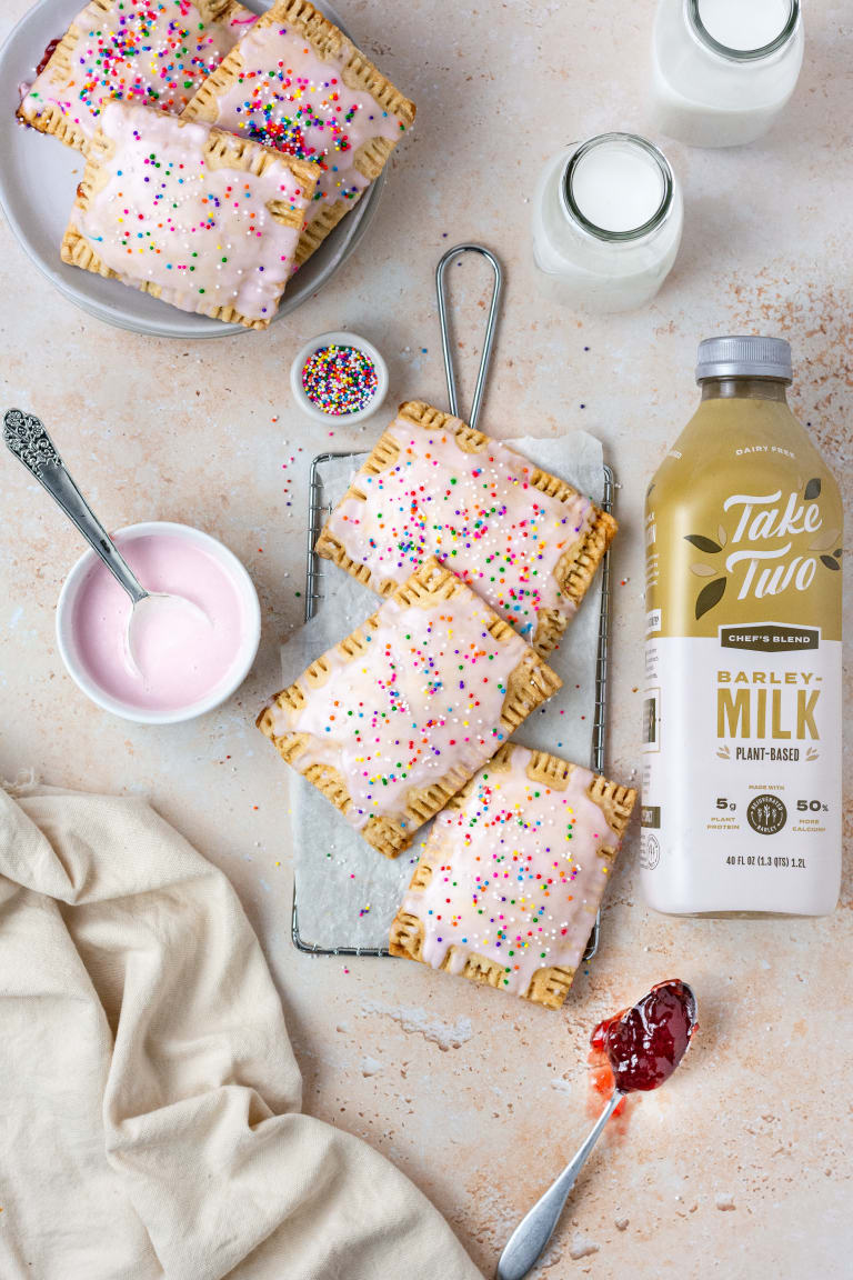 In a small bowl, whisk together the powdered sugar, barleymilk, and pink food coloring. The icing should have a very thick, but still spreadable consistency. If necessary, add one splash of milk at a time, until that consistency is reached. Spread a spoonful of icing over each pop tart, top the icing with sprinkles, and allow to sit for at least 30 minutes so the icing can set.