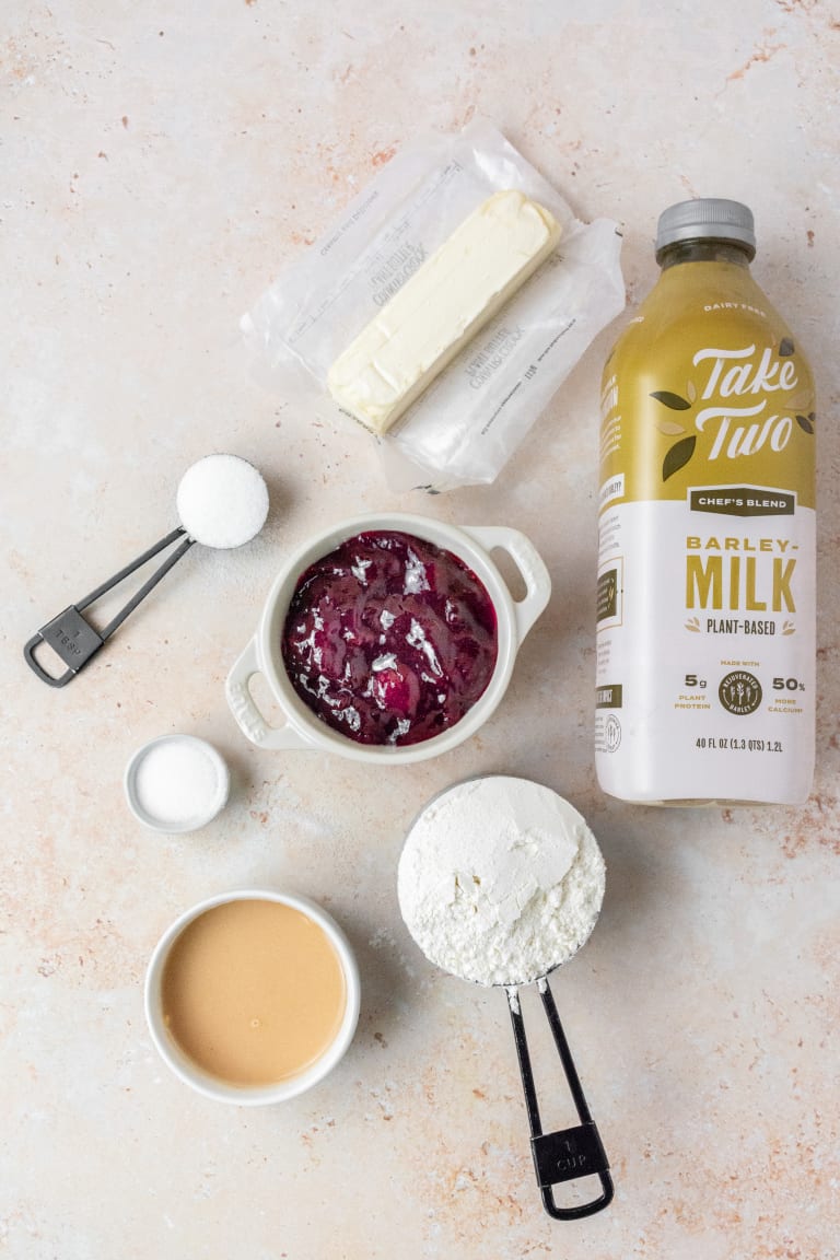 Make the Pastry Crust: In a large bowl, whisk together the flour, sugar, and salt. Using a fork or your hands, mix in the butter until the mixture holds together when you squeeze it. In a small bowl, whisk together the flax egg and milk and add to the dough. Mix together with a fork until everything is evenly moistened. Knead the dough on a floured surface only for a minute.